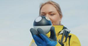 A woman holds the Sensor Globe, the namesake product of one of Hatch Blue's portfolio companies. Sensor Globe delivers next-gen monitoring solutions designed to give fish farmers real-time insights during critical operations such as crowding, transfers & handling.